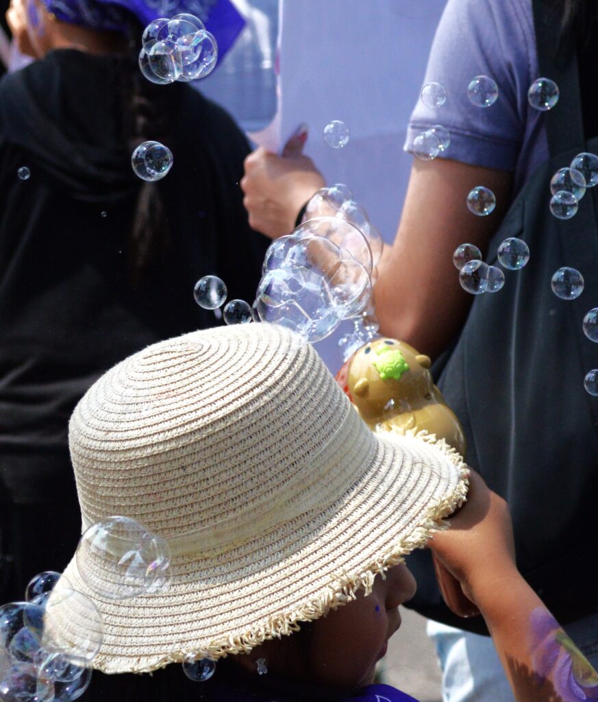 La manifestación partió del monumento a Luz Jiménez, escritora y traductora náhuatl cuya figura no pasa desapercibida por los contingentes. El que encabeza la manifestación es el de familiares de víctimas de feminicidio; víctimas indirectas, entre quienes se encuentran adolescentes, niñas y niños. Muchos de ellos no dejaron de gritar consignas durante el recorrido mientras avanzaban con sonrisas y brillos en el rostro, entre la transparencia de burbujas y el morado intenso de paliacates, carteles, coronas, alas.